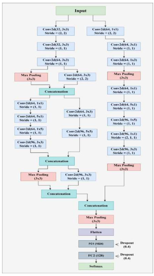 Each branch consists of a series of convolutional blocks, which are then finished with maxpooling layers to decrease spatial measurements while keeping significant hierarchical information. One of the key features of the architecture is the use of concatenation layers, which combine feature maps of different branches. The same is shown in Eq. 4, which allows the network to retain and integrate information from multiple scales, preserving global and local spatial patterns.