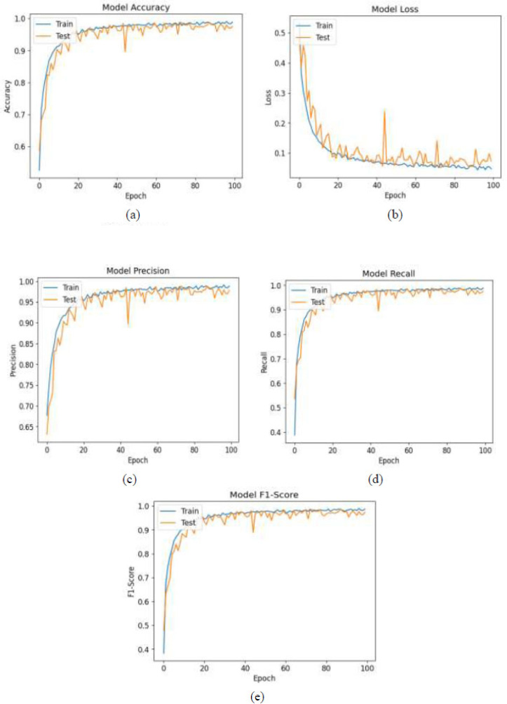 Trade-off curves between training and validation(a) Accuracies, (b) Loss, (c) Precision, (d) Recall, (e) F1-Score