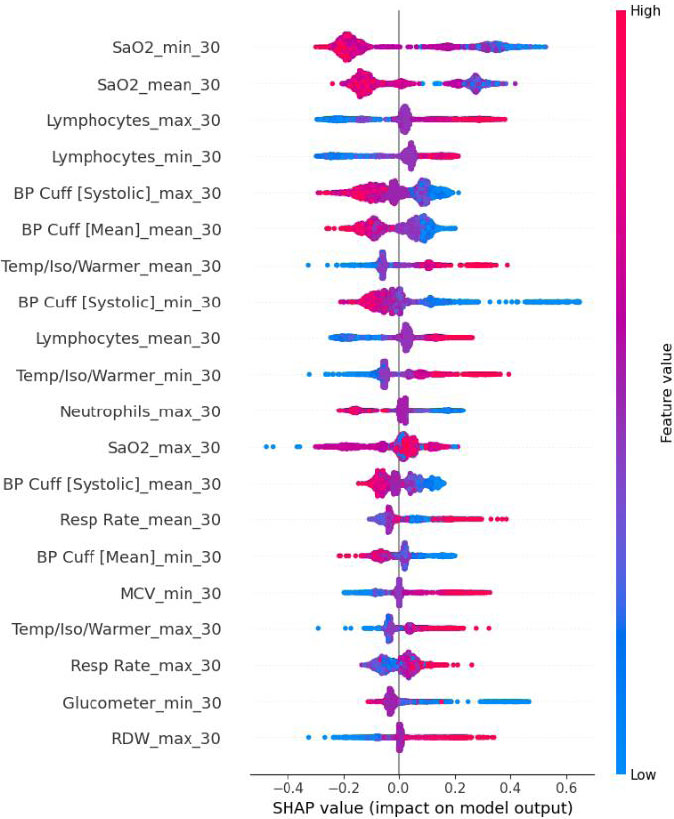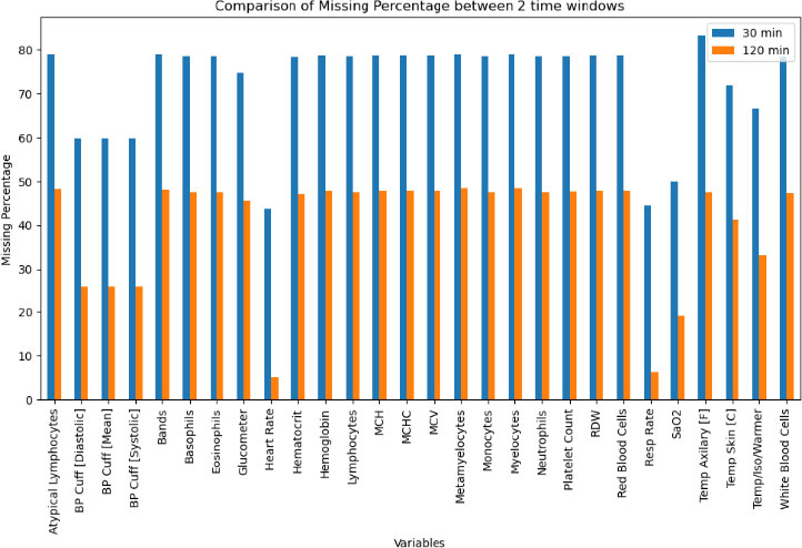Table 1 presents the final list of 23 selected variables. In the 30-minute dataset, several variables exhibited notably high missingness rates (e.g., atypical lymphocytes, bands, basophils, and other hematological markers often missing in over 70% of cases), while respiratory- and temperature-related features (e.g., heart rate, resp rate, temp skin) showed comparatively lower missingness (40–70%). Overall, most mean values differed between the infected and non-infected groups in the 30-minute window, with parameters, such as heart rate, neutrophils, and white blood cells, tending to be higher in the infected cohort. By contrast, the 120-minute dataset contained fewer missing observations across many features (most falling in the 20–50% range) and maintained a similar pattern of differences between infected and non-infected groups (e.g., higher heart rate and lower neutrophils among infected). Although the mean values of several variables (e.g., basophils, monocytes) remained comparable across groups, both time windows demonstrated consistent distinctions in key physiological and hematologic parameters between infected and non-infected neonates.