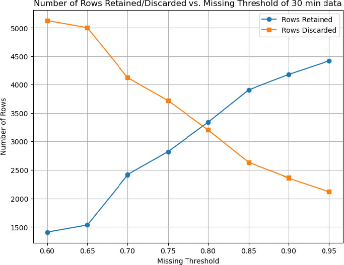 • 30-Minute Data: At the lowest threshold (0.60), only about 1,500 rows are retained, while approximately 5,000 rows are discarded, indicating that many rows exceed 60% missingness. As the threshold increases, the strict row-removal criteria are relaxed, allowing more rows to remain in the dataset. By a threshold of 0.95, nearly 6,500 rows are retained and fewer than 500 are excluded (Fig. 3).