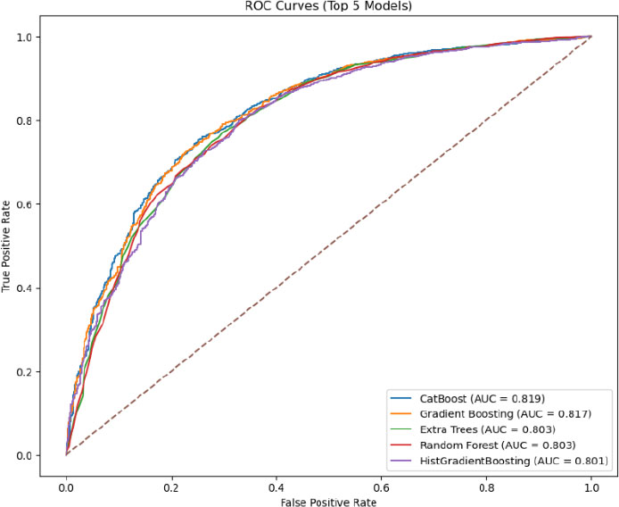 In contrast, (Fig. 6) shows that CatBoost was the best-performing algorithm on the 30-minute data based on F1-score (0.7634), narrowly surpassing Gradient Boosting (0.7628) and other tree-based methods (e.g., Random Forest, LightGBM) in terms of balanced predictive performance. Although some algorithms (e.g., Logistic Regression) also demonstrated robust accuracy, CatBoost’s specialized handling of categorical features and iterative boosting resulted in more balanced gains in precision and recall, making it particularly effective in this shorter time window, where missing data and limited observation periods can constrain model inputs.